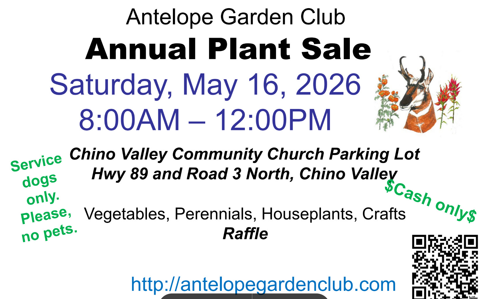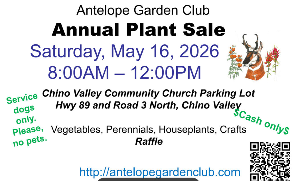 Welcome to the Antelope Garden Club website. We are located in Chino Valley Arizona. We meet on the first Mondayof the month at 1:00 PM at GraceChurch, corner of Hwy 89 andOuter LoopRoad. Meeting dates aresubject to change.